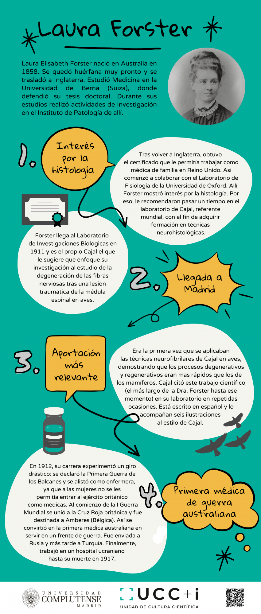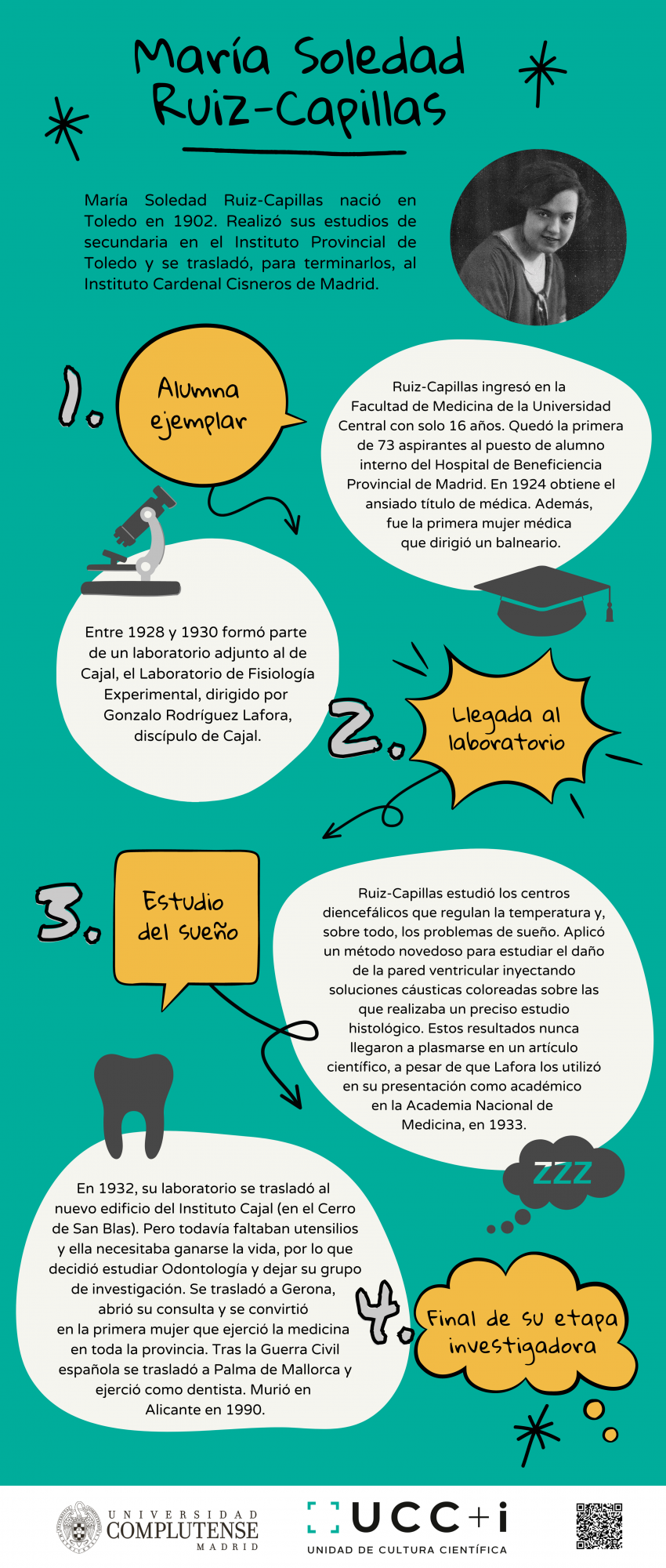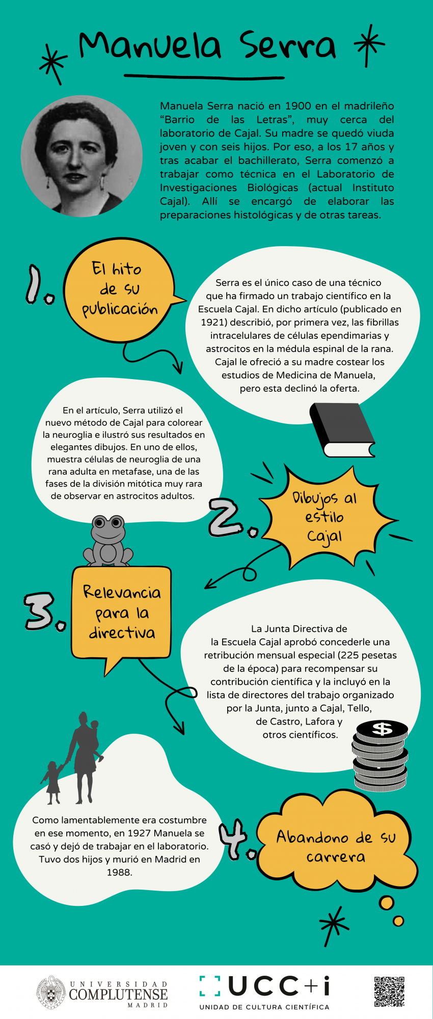 Tras una exhaustiva búsqueda, las investigadoras de la UCM dieron con varios nombres, mujeres que trabajaron en el laboratorio de Cajal y a las que él mismo reconoció su labor científica. Las historias de Manuela Serra, Laura Forster y Soledad Ruiz-Capillas se materializan en el cómic “Ellas también son escuela Cajal”, diseñado por la ilustradora científica Miriam Rivera (Biomiics).
