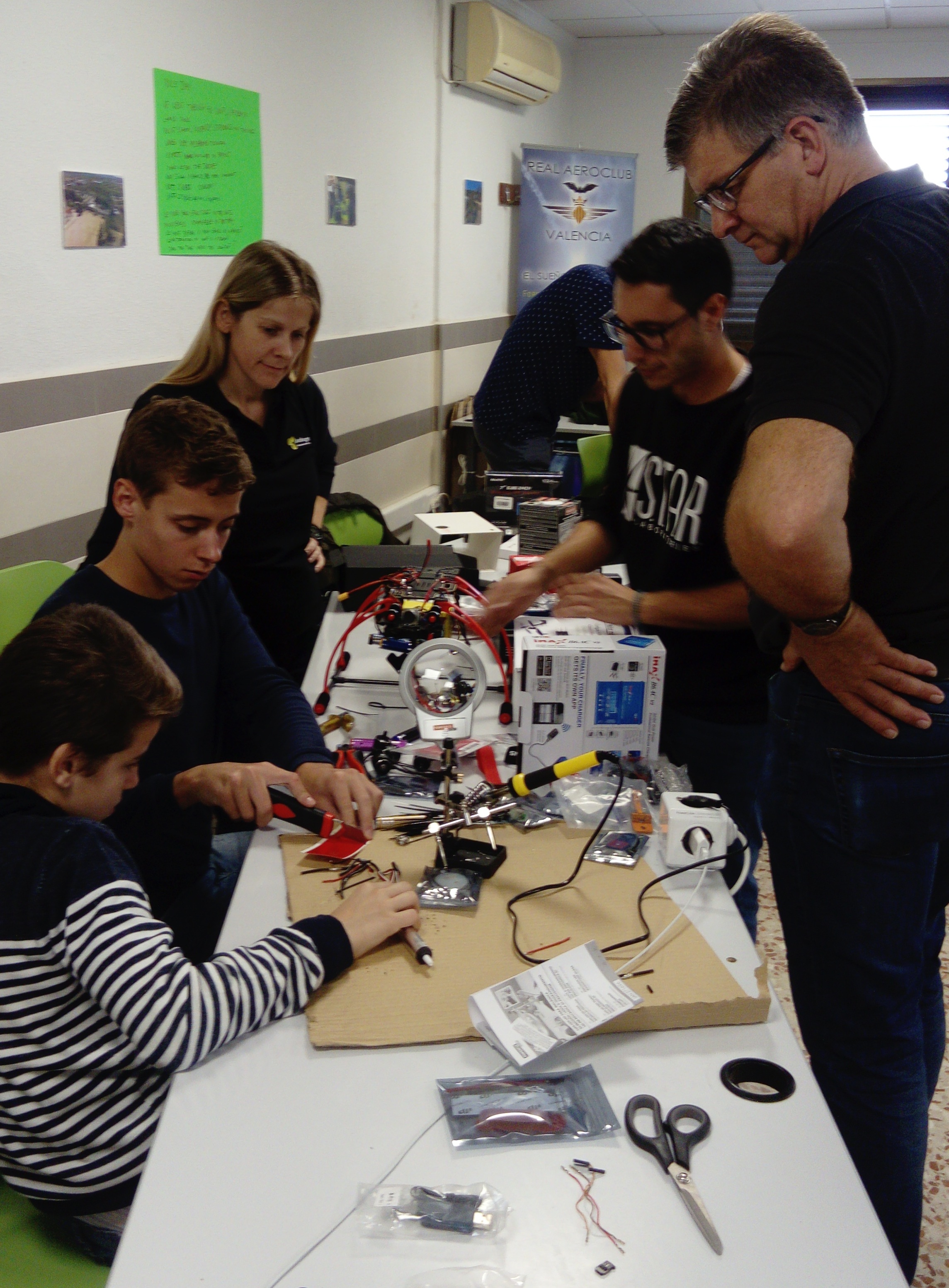 - Semana de Formación. Durante 5 días se formó a los profesores participantes en la construcción de un dron y en sus aplicaciones en agricultura. El curso se celebró en noviembre en Llombai (Valencia), en EFA La Malvesía, con la participación de expertos en drones como Joaquín Sanchez y Juanjo Martí. Después, cada grupo hizo las modificaciones pertinentes a los contenidos formativos que habían desarrollado previamente y desarrollaron vídeos didácticos al respecto. Todo el material está ya a disposición de cualquiera en el MOOC citado anteriormente dentro de la web Edudrone.eu.